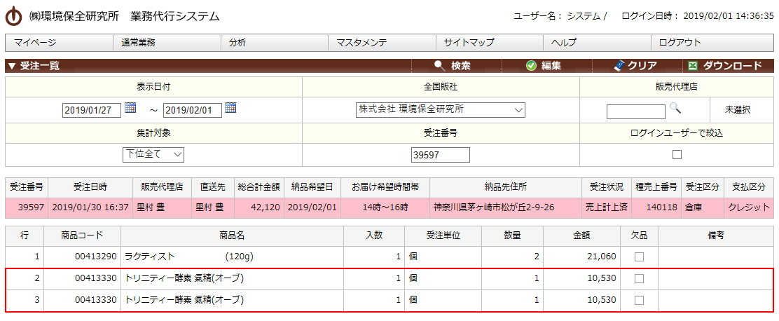 | 受注番号 | 売上日 | 注文代理店ID | 代理店名 |